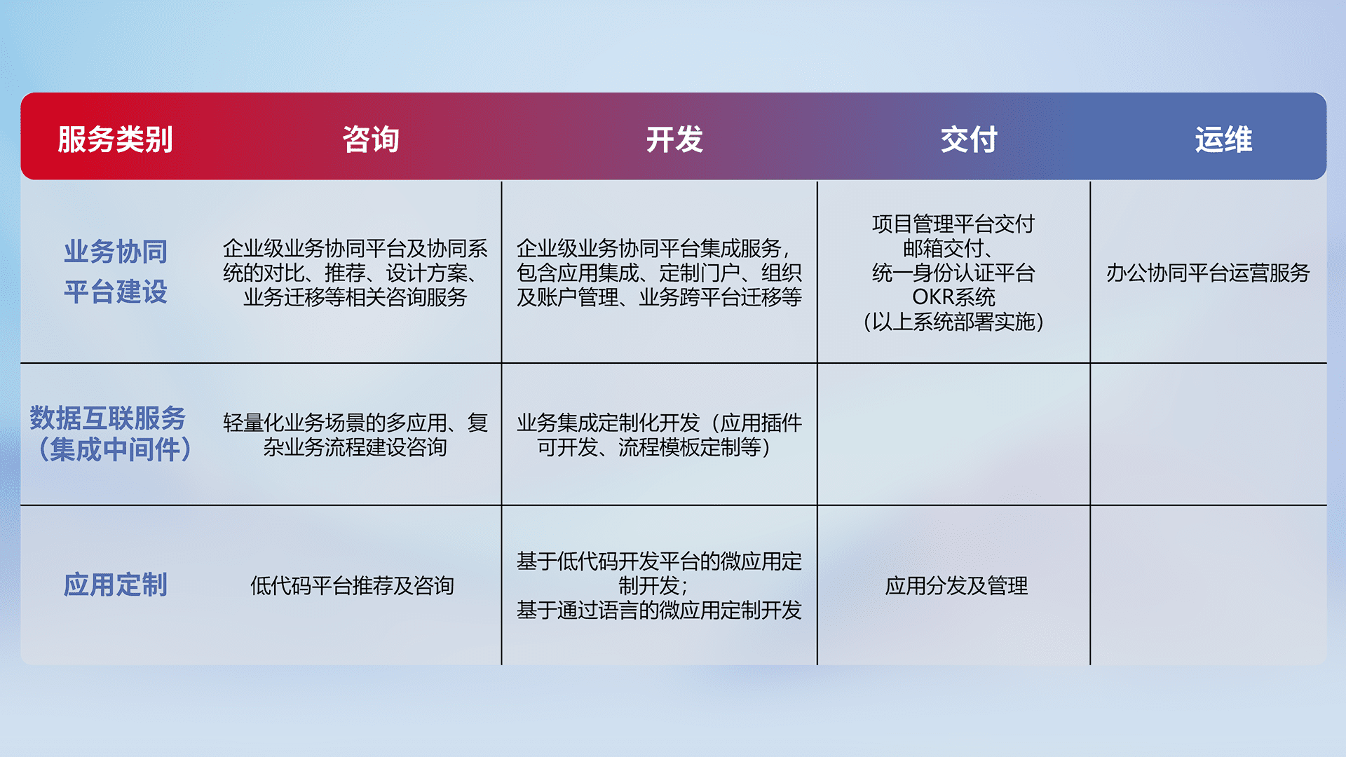 针对钉钉、、、、企微、、IDaas等平台级产品提供产品的规划、、、方案、、交付、、定制化开发等服务,,,实现如统一协同办公、、、智能客户服务、、、混合会议管理、、智能数据查询、、、等业务场景,,实现数字化转型。。